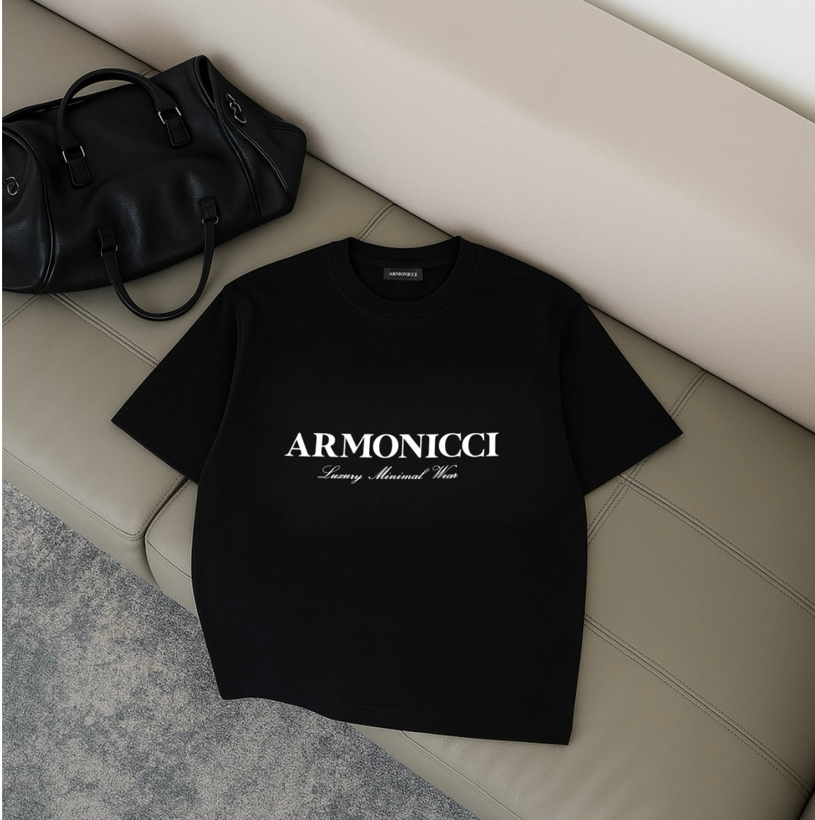 The Oversized Black Script Logo T-Shirt made with premium cotton, featuring the large ARMONICCI Luxury Minimal Wear script logo. An oversized fit with a high crewneck mock neck collar for that essential luxury minimal streetwear look. Formed using 250GSM 100% premium cotton for that ultra premium streetwear fit.