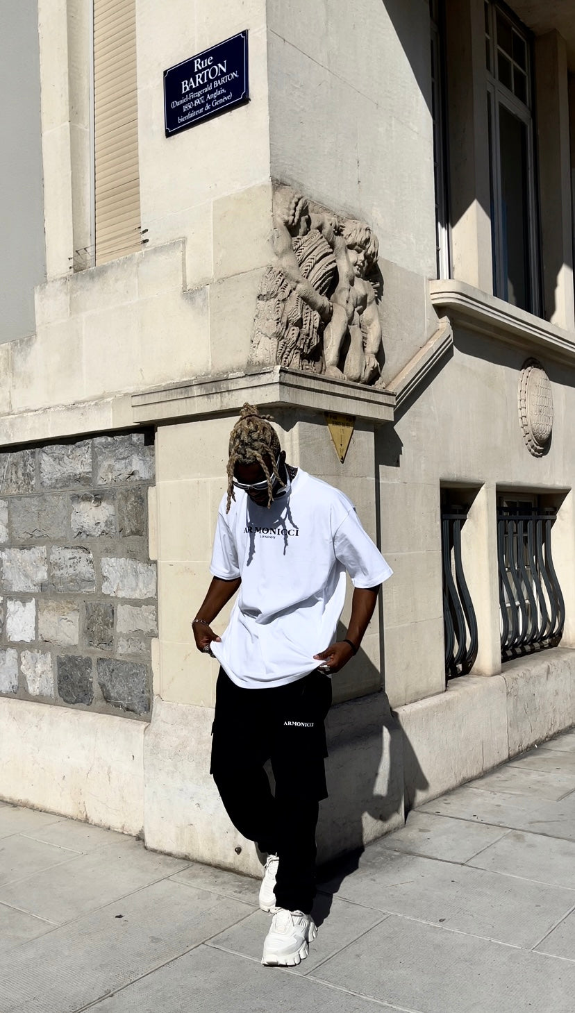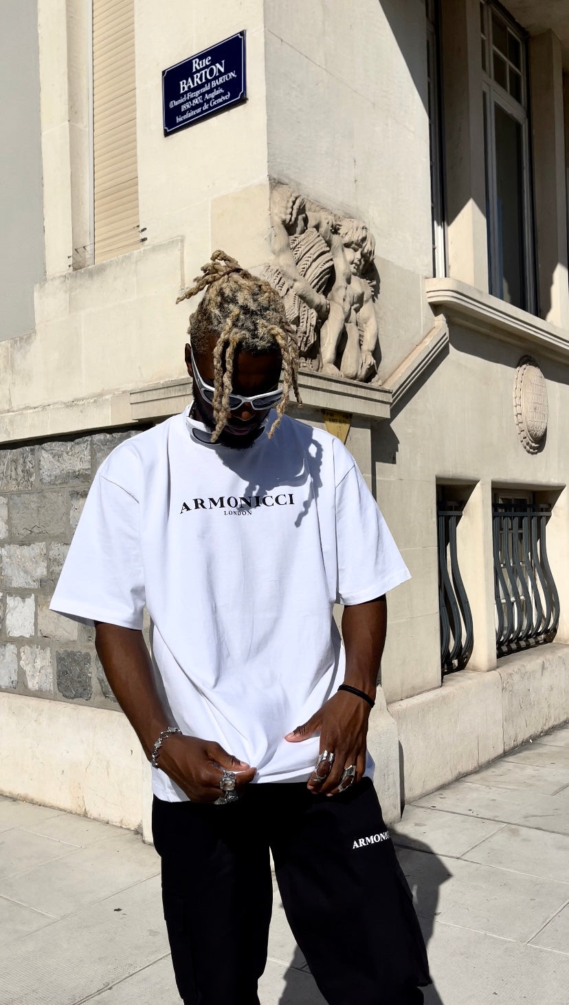 The Short Sleeve Oversized Pure White T-Shirt featuring the ARMONICCI LONDON logo, provides an oversized fit with a high crewneck mock neck collar for that essential luxury minimal streetwear look. Formed using 250GSM 100% premium cotton for that ultra premium streetwear fit.